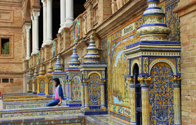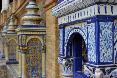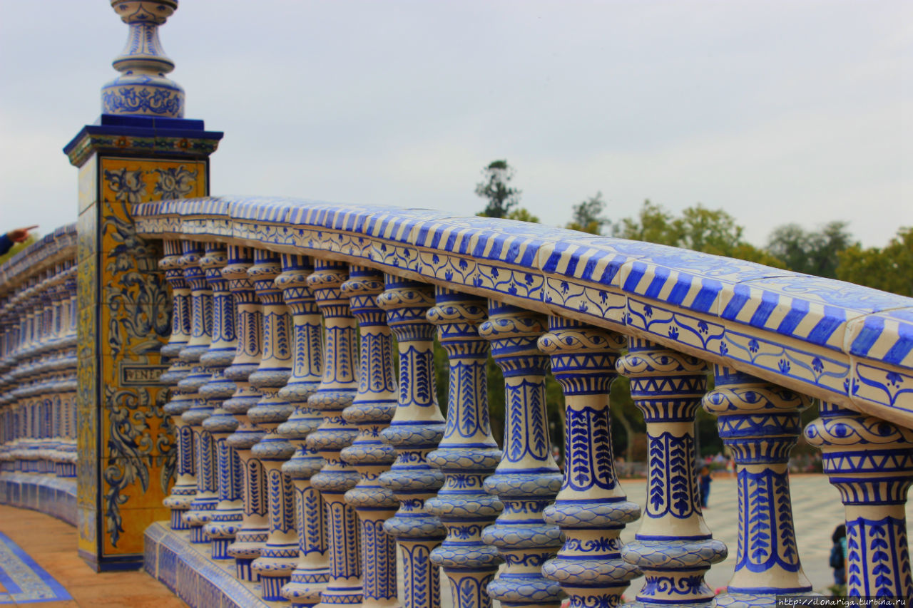 Так получилось и у меня с площадью Испании. Лет пять назад я увидела в альбоме своей знакомой фотографии из этих мест. На них девушка в голубом платье сидела на скамеечке посреди всей этой яркости и красоты. "Боже, где это сказочное место с пряничным городком и разноцветной глазурью?" — спросила я. "Это площадь Испании в Севилье. Очень атмосферное место"- ответила она.