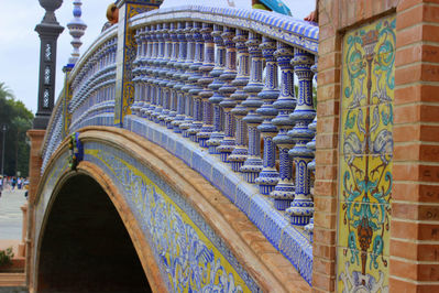 Грациозные мостики, перекинутые через полукруглые каналы и украшеные невероятным образом, выглядят совершенно неописуемо и нарядно. Сплошная гжель и хохлома на испанский лад! Но при этом весь огромный комплекс показался мне весьма органичным.