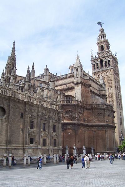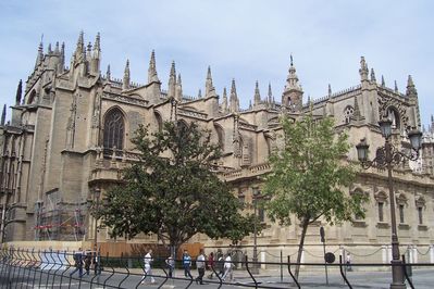 Собор является главной достопримечательностью Севильи. Попробуйте попросить кого-то назвать три самых больших собора Европы. О первых двух, скорее всего, вы получите быстрый и правильный ответ: Соборы Святого Петра в Риме и Святого Павла в Лондоне. А вот с третьим собором, наверняка, будет затруднение. И когда вы скажете, что это Севильский собор, многие удивятся. В самом деле, его площадь превышает площадь футбольного поля. Чего никак не скажешь, находясь с ним рядом, так как он окружен городской застройкой и хорошо виден только с площади Триумфа и площади Королевской мадонны. Его построили в XV-XVI веках на месте мечети. Это был период расцвета Севильи, когда она была главным портом Европы на торговом пути с Вест-Индией. Трудно в это поверить, глядя на мелководный Гвадалквивир – реку, соединяющую Севилью с морем. Однако в те времена он был судоходным для морских судов. Поэтому появление такого огромного собора в одном из самых богатых городов Европы не удивительно. Считается, что кафедральный крест сделан из первого золота, привезенного Колумбом в Севилью. Внутри собора имеется свинцовая гробница великого мореплавателя, но чьи останки находятся внутри до конца не ясно, так как Колумб, как известно, умер и был похоронен в Америке, а потом его останки несколько раз перевозили туда-обратно. Тем не менее, находясь в соборе, вы можете отдать почести этому человеку.