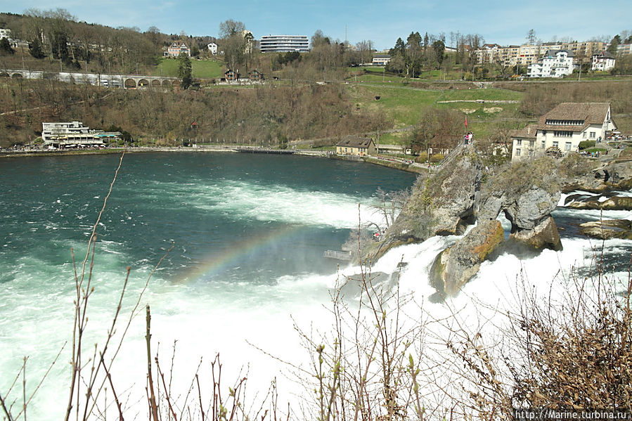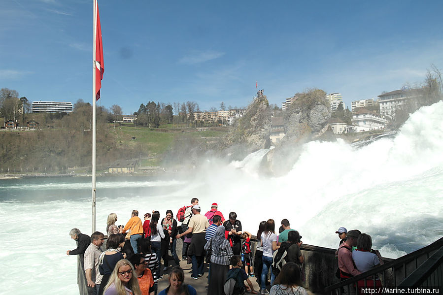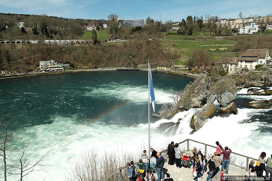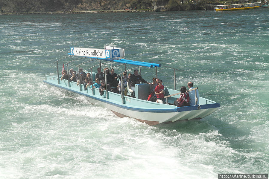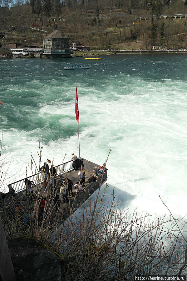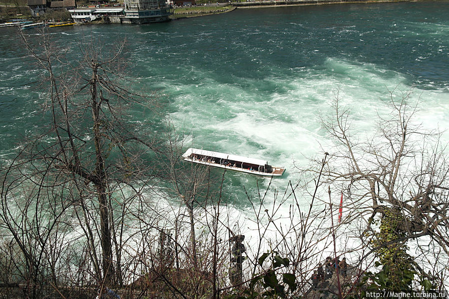 Если хочется насладиться водопадом поближе — можно прокатиться на кораблике. Кораблик ходит каждые 10 минут. Стоимость примерно 5-7 франков.
