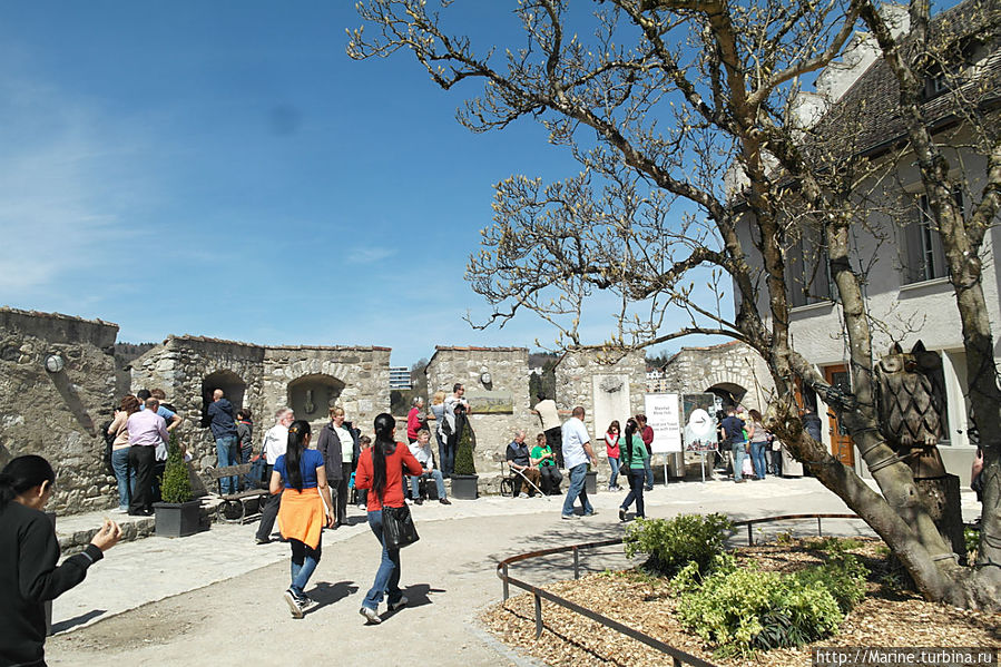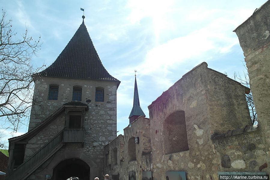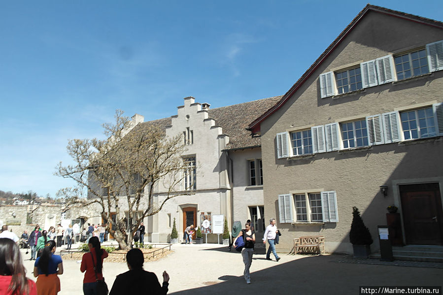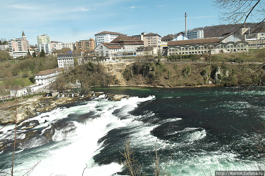 На горе возле водопада возвышается старинный замок Schloss Laufen (Замок Лауфен). Надпись на гербе Замка Лауфен гласит: "Господь сохраняет нас в мире". Замок расположен прямо над Рейнским водопадом.