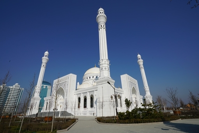 В чеченском городе Шали, что в 35 километрах от Грозного, меньше года назад — в августе 2019 года — открыли новую, самую вместительную в Европе мечеть. Здесь одновременно могут выражать своё вероисповедание до 100 тысяч человек: в здании мечети 30 тысяч человек, а еще 70 тысяч — на прилегающей территории. Мы подъехали к ней солнечным утром 9 марта. На фоне ярко-синего неба блестела белизной стен и минаретов ажурная мечеть. Восторг группы был единодушным.