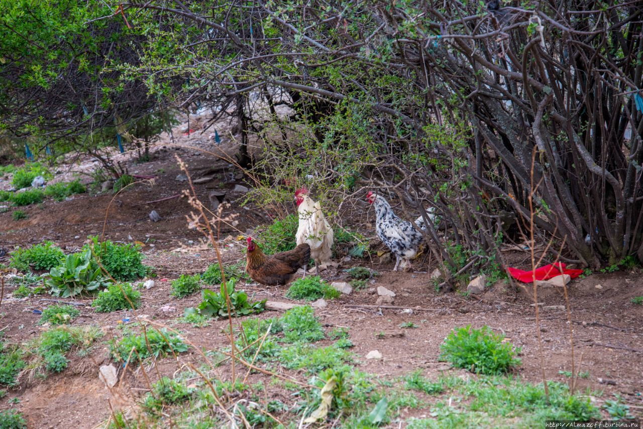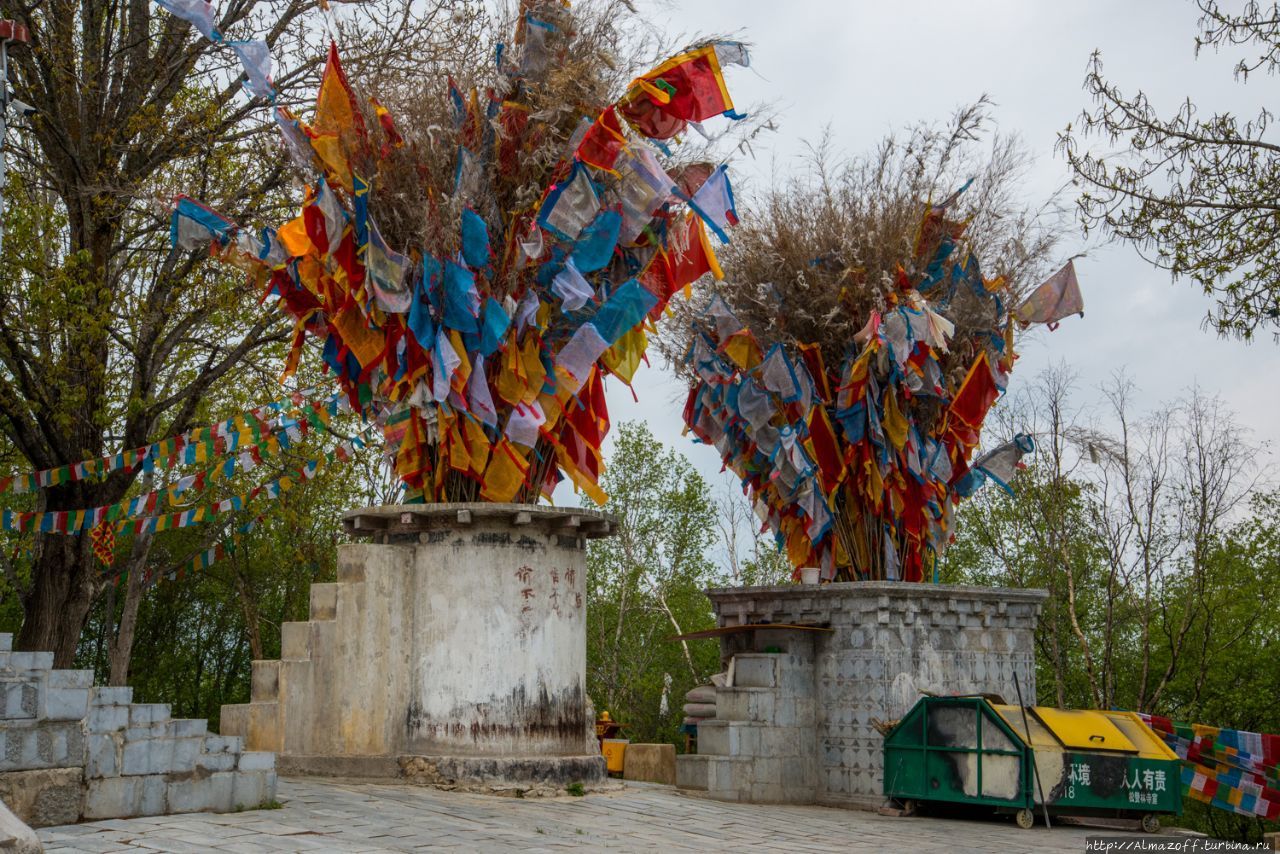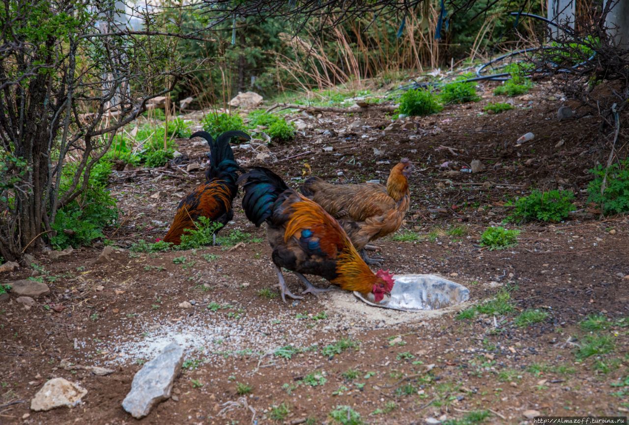 По лесистой тропинке, мимо молитвенных флажков поднялся к храму 1000 Куриц. Не знаю как называется он по-тибетским, но китайское название оправдывает себя — вокруг храма в кустах пасутся ну если не тысяча, то сотня куриц и петухов, а ещё две свиньи — мать и поросёнок, которые увидев меня, убежали вниз по склону.