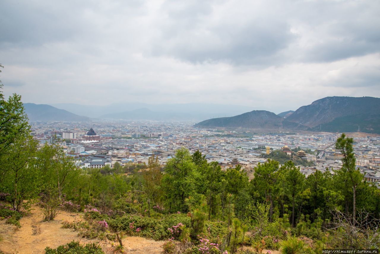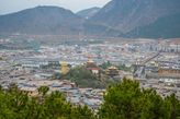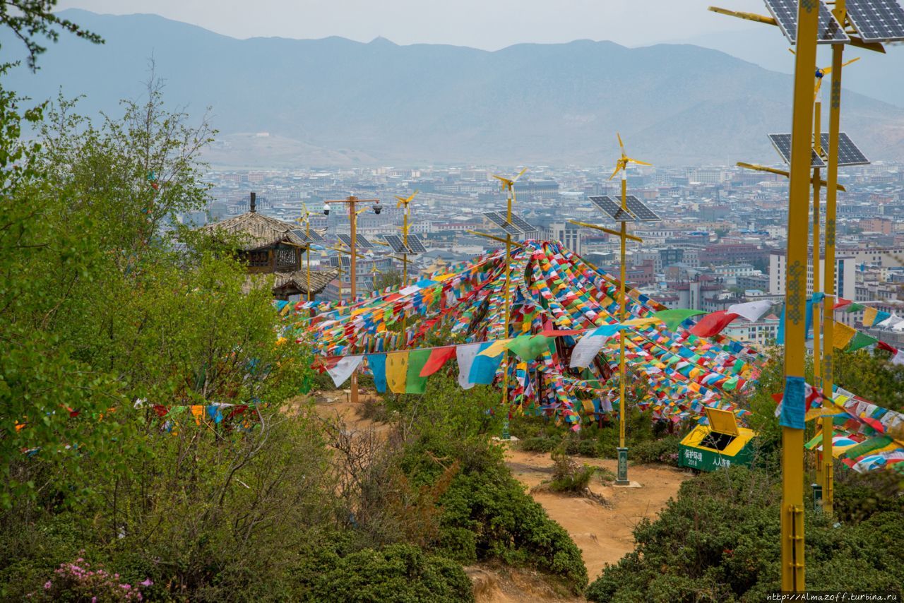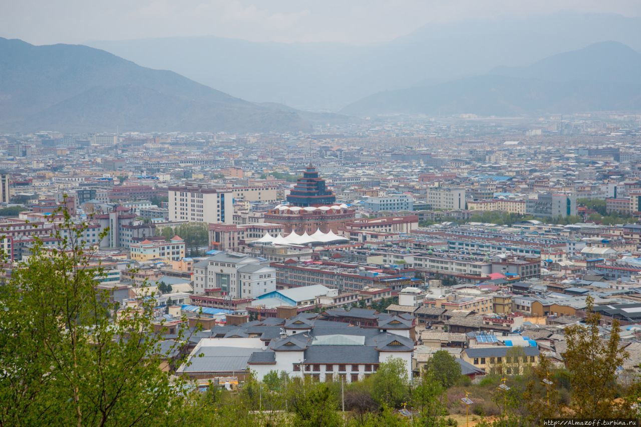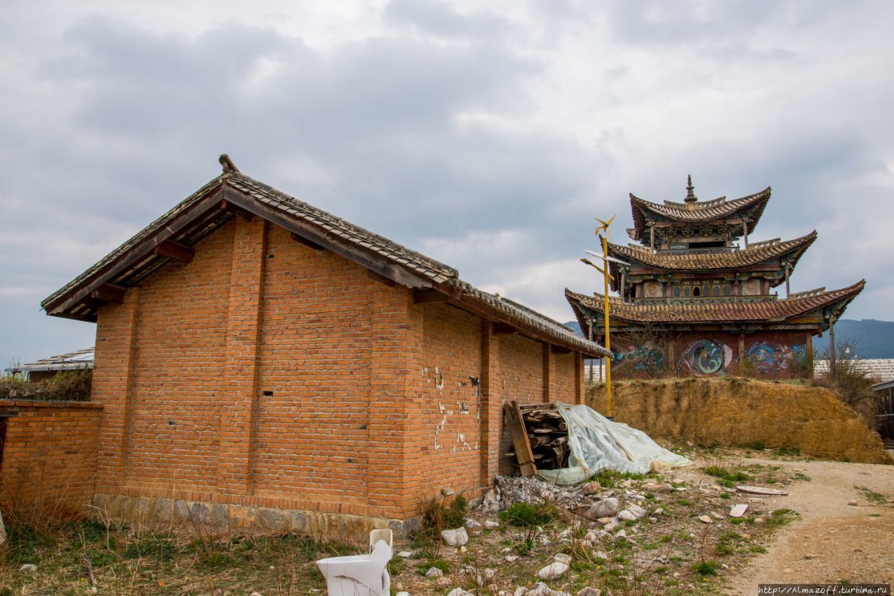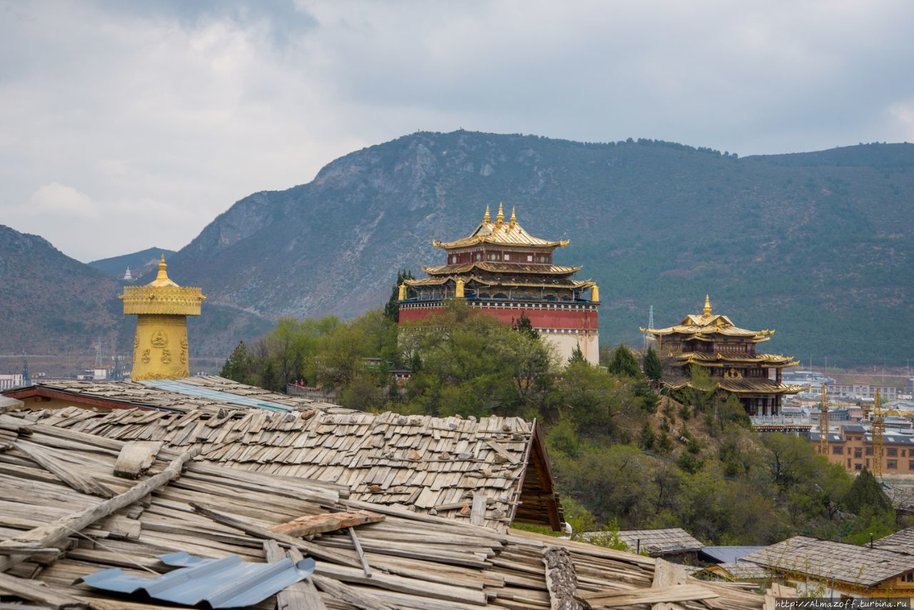 Пройдя несколько сот метров от гестхауса по старому городу, свернул в сторону холма. Очень быстро начались задворки старого города с грунтовой дорогой, с кустами, со стенами старых домов и заброшенным храмом. Храм буддийский, в свое время наверняка было очень интересен. А сейчас нижний ярус его исписан граффити. Очень необычный вид — чуть-чуть поднявшись выше сфотографировал заброшенный храм и новые молитвенный барабан, новый гелугупинский храм на холме, на контрасте всё. На противоположных склонах идет большая стройка, строят новые микрорайоны с таунхаусами. Новая Шангри-Ла шагает в будущее.