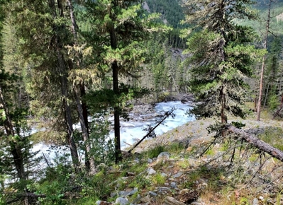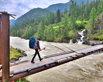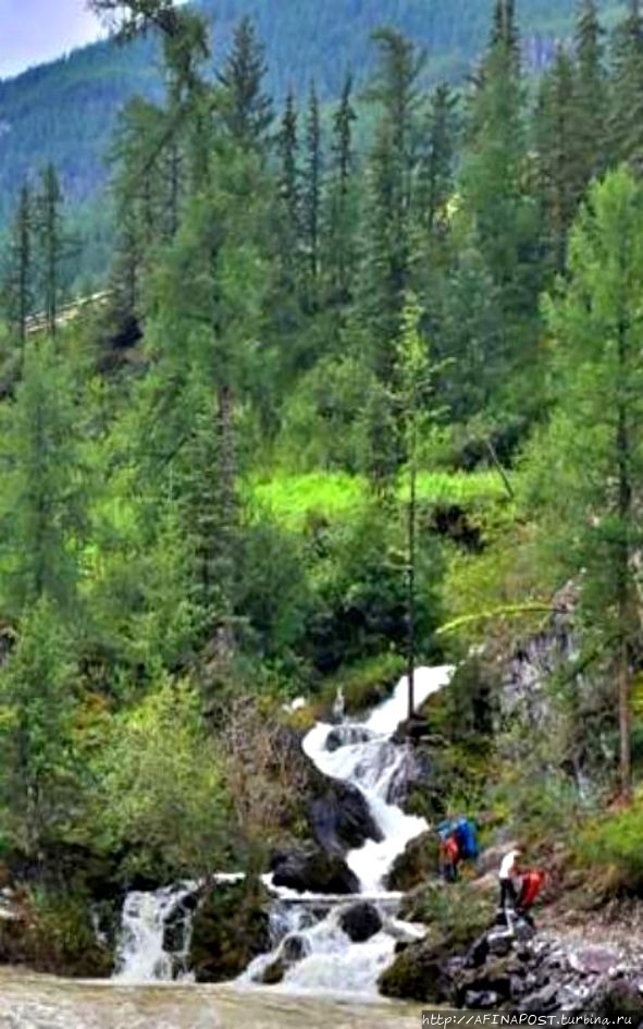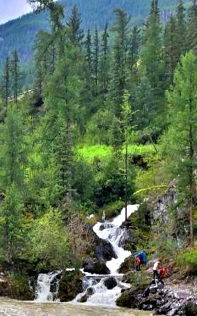 Первую часть дневного пути мы проехали на автомобиле УАЗ, далее, с тяжёлыми рюкзаками на плечах долго шли вдоль реки Чуя, перешли на другой берег реки по Оройскому мосту. За мостом начинается тропа, надо идти вверх через красивый лиственный лес. Идём медленно, любуясь по пути шумными лесными водопадами и набирая высоту в сторону Оройского перевала. Вскоре тропа становится более пологой. На ночёвку располагаемся на стоянке у ручья Орой в окружении могучих кедров.