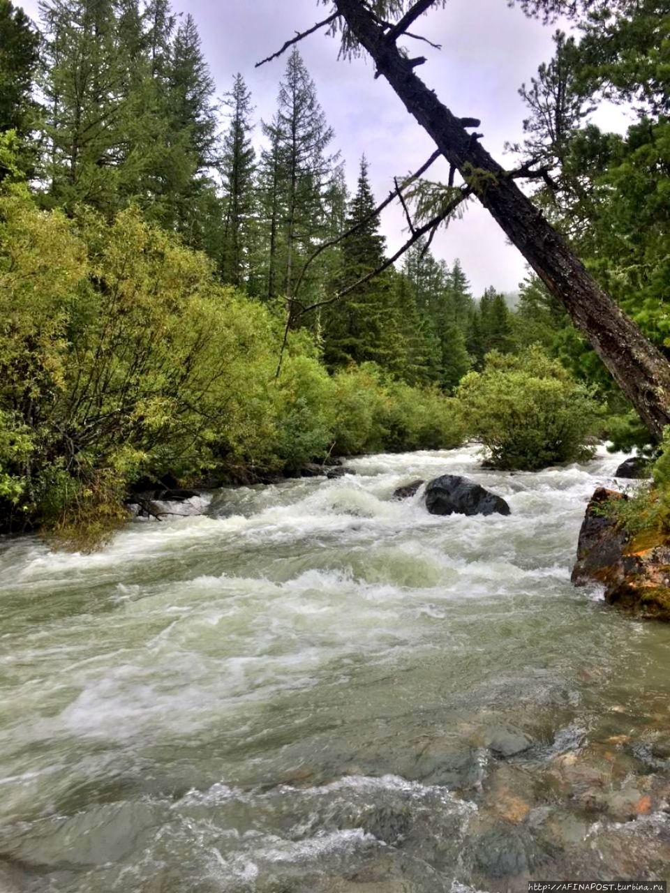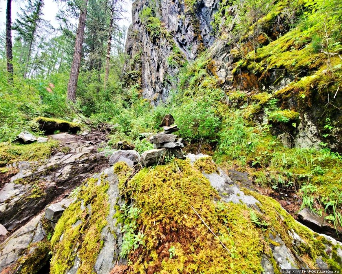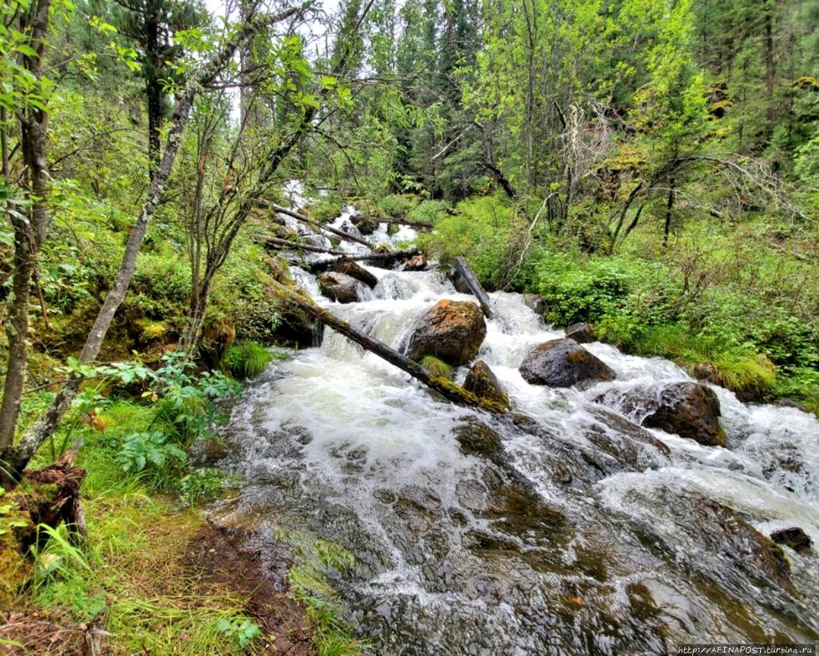 В первой половине дня тропа проходит по дремучей тайге с брусничными зарослями, часто на пути встречаются заболоченные участки. Прошёл дождь, сырость со всех сторон, но настроение хорошее, молодёжь шутит, поёт песенки.