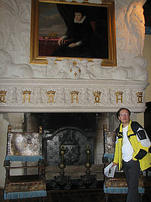 Заходим в главный вестибюль с интересным стрельчатым потолком и слева по ходу движения попадаем в покои Дианы де Пуатье. Горящий камин согревает комнату, как в старые времена. А на нас с портрета смотрит сама хозяйка.