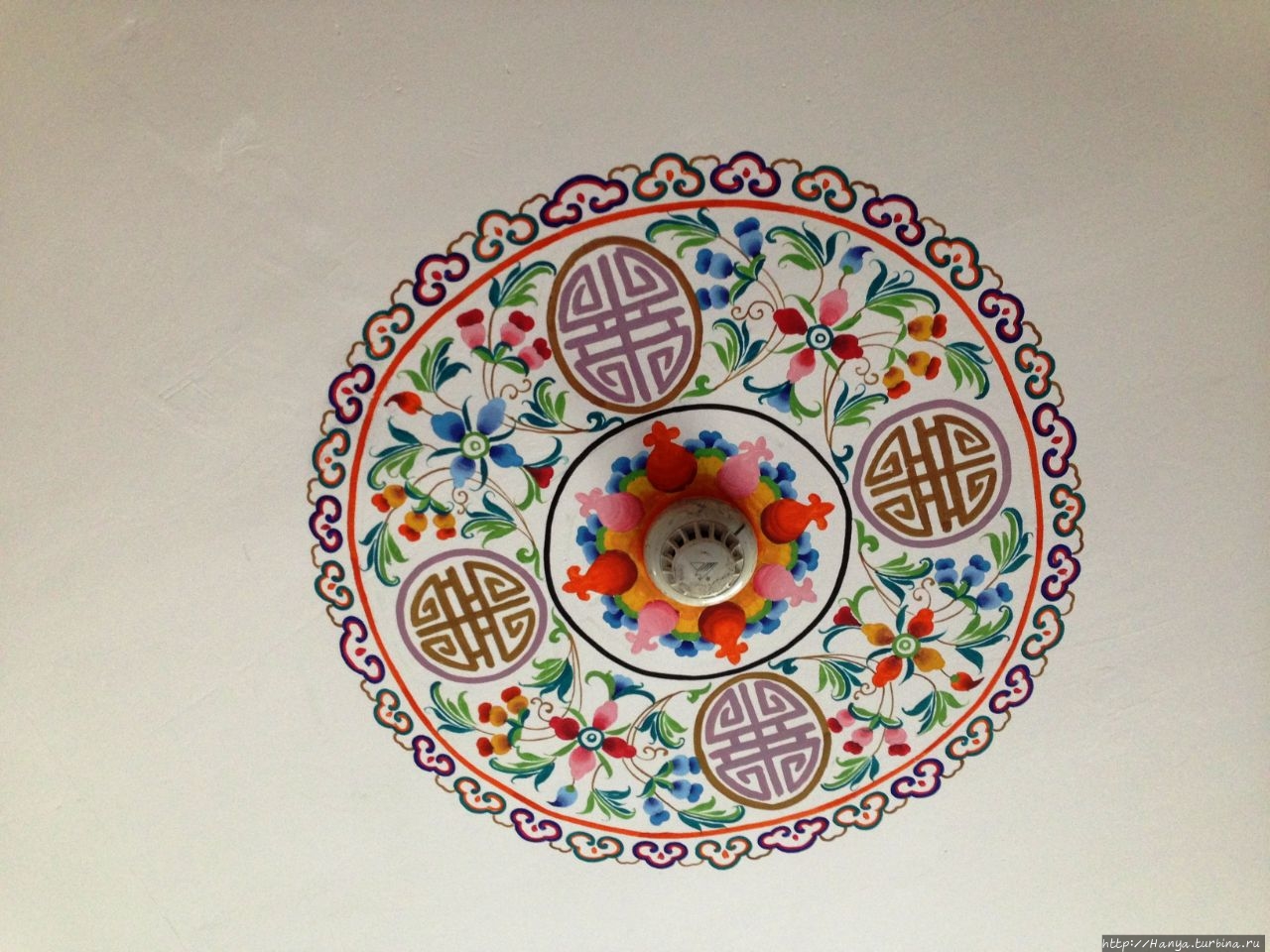 Живописная дорога в бывшую столицу Тибета. Ч.60), мы попадаем в город Шигацзе, где обитает Панчен-Лама. Прежде чем мы поедем на экскурсию в монастырь, нас заселяют в отель Manasarovar Hotel, и это хорошо, потому что можно отдохнуть от дороги и переодеться. Отель оказался с большими номерами в традиционном тибетском стиле с узорами на потолке, причем узоры удивительным образом скрывают противопожарный индикатор, которыми теперь «модно украшать» потолки во всех помещениях.