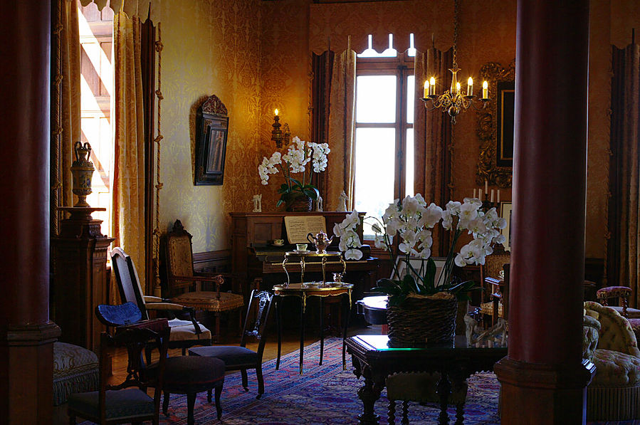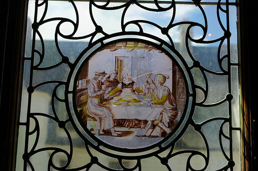 На момент нашего посещения замок был разделен на две части. Первый этаж – это полностью отреставрированные залы с чудесной мебелью и витражами.