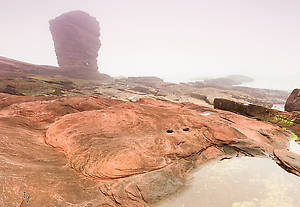 После заселения в отель отправились на закатную съемку замка Дуннотар. Облака низкие, кое-где с проблесками, так что была надежда поймать свет. Но за полчаса до точки мы въехали в стену тумана. Видимость упала до 40-50 метров. Само собой, замок предстал перед нами огромным пятном, слившимся со скалой. Уже третий раз я здесь, и никак не получается сделать снимки. Заколдованное место! Вечером хозяин отеля в Данди важно сообщил, что такой туман шотландцы называют Хар. И похоже, мы этому Хару очень понравились, потому что и на следующее утро он никак не хотел убираться. Вздохнув, мы решили не расстраиваться и все-таки сделали несколько снимков на фоне Головы Дьявола и Красных скал. И не поверите, только отщелкались, Хар тут же нас покинул...