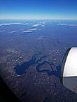 Дальше ушли в облака и я думал все, финита... Но Облака развеялись и мы долго летели над штатом Нью-Йорк. Как же он отличается от привычной Европы. Там все вспахано, "порезано" на аккуратные участки разного цвета... Здесь же пустошь (так кажется сверху), по которой хаотически разбросаны дома и поселки. Иногда картинку оживляют водоемы...