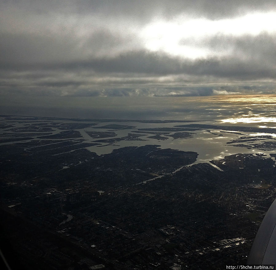 Дальше ушли в облака и я думал все, финита... Но Облака развеялись и мы долго летели над штатом Нью-Йорк. Как же он отличается от привычной Европы. Там все вспахано, "порезано" на аккуратные участки разного цвета... Здесь же пустошь (так кажется сверху), по которой хаотически разбросаны дома и поселки. Иногда картинку оживляют водоемы...