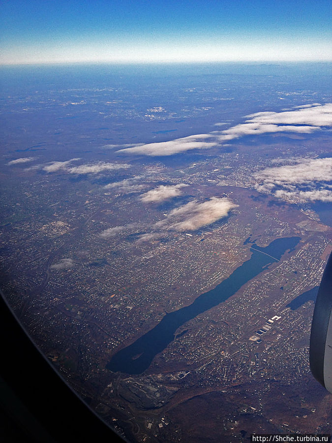 Дальше ушли в облака и я думал все, финита... Но Облака развеялись и мы долго летели над штатом Нью-Йорк. Как же он отличается от привычной Европы. Там все вспахано, "порезано" на аккуратные участки разного цвета... Здесь же пустошь (так кажется сверху), по которой хаотически разбросаны дома и поселки. Иногда картинку оживляют водоемы...