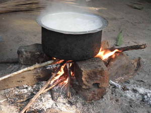 Семья оказалась большой — пятеро маленьких детей, несколько молодых женщин (невестки? сестры?) купали детей, два мужика латали крышу (скоро сезон дождей), женщина постарше (видимо мать семейства) варила на костре рис. Еще один мужик давил масло. В общем, простой крестьянский быт. Двор довольно большой, но захламленный жутко! Видимо, ничего не выбрасывается, все идет в дело!