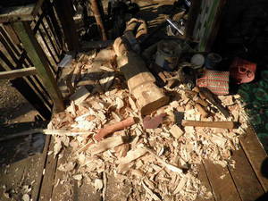 Гуляя по Нгапали, мы увидели небольшой магазин. Он стоял вдоль дороги и имел гордую надпись "Скульптурная история"). По крайней мере, мы так перевели...Интересно было посмотреть на его работы. Небольшие статуэтки от 20 до 120 сантиметров. Его рабочее место было тут же. В углу валялись опилки, нехитрый инструмент и будущие "истории". Конечно, он отвлекся, увидев потенциальных покупателей. Поболтав пару минут, он на бирманском, мы на русском, жестами попросили показать его жилье. Он любезно пригласил нас к себе во двор, тут же, за магазином.