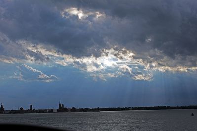 Мы с моста въехали в город около 6 вечера. Для начала июля это означало еще минимум 4 часа светлого времени суток. Кстати, на въезде встретили St. Marienkirche — один из символов города, как раз живой пример кирпичного зодчества. Как видите, погода не предвещала особых осложнений.