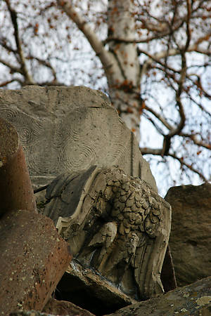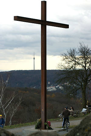 Снизу на самый верх горы по уютному парку ведет серпатинообразная дорожка со скамеечками. А наверху находится памятник погибшим — обломки штутгартских зданий и крест.