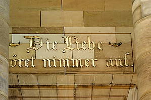 Над центральным портиком надпись — "Любовь никогда не кончается".Белый купольный зал украшен статуями евангелистов. У внутренней колоннады размещается иконостас — здесь находится русская православная церковь