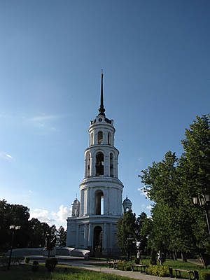 "Большое российское" путешествие 2012.А мы очень хотели поближе рассмотреть колокольню Воскресенского собора (1799 г), которая видна со всех подъездных дорог. И она не разочаровала! Около колокольни разбит сквер, где отдыхают горожане и туристы. Особых безобразий, кстати, там не заметили. Зато заметили у подножия колокольни очень интересную скульптурную группу — Памятник священнослужителям и верующим, пострадавшим за веру. Неподалёку есть ещё площадь, украшенная цветами и фонтаном. Так что, погулять есть где!