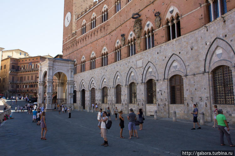 Дворец коммуны с примыкающей к нему Башней Обжоры находится в нижней части площади Кампо и является центром архитектурной композиции площади и главной градостроительной доминантой Сиены.