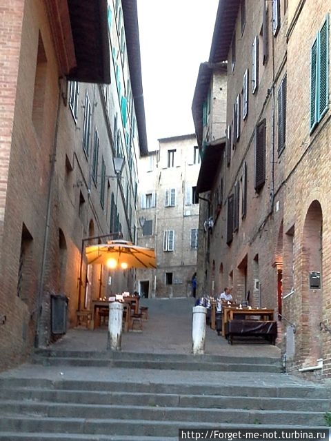 При заселении Франческо, хрипловатый, улыбчивый, кудрявый хозяин отеля – настоящий итальянец – выдрал из большого блока схему города и лихо накалякал круги и стрелки. «От отеля до центра – 5 минут». Слукавил, шельма: это до виа Камолиа 5 минут, а до Пьяцца дель Кампо – все 25. «Эта точка – Кафедральный собор, это Санта-Катерина (честно-честно, он так Сан-Доменико обозвал), это Святой Франческо. Вот здесь Центральная площадь, ратуша, прямо за ней самый старый район в городе. Там ничего особенного – просто самые старые дома и красиво». И еще добавил: «Возле площади есть нельзя. Много туристов, не всегда вкусно и very-very expensive». Поэтому ужинали мы в тот день «по стрелке» — предъявителю почерканой схемы скидка 10%.