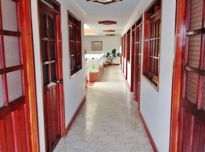 Вход в мой номер из этого продолного коридора в форме внутреннего балкона.