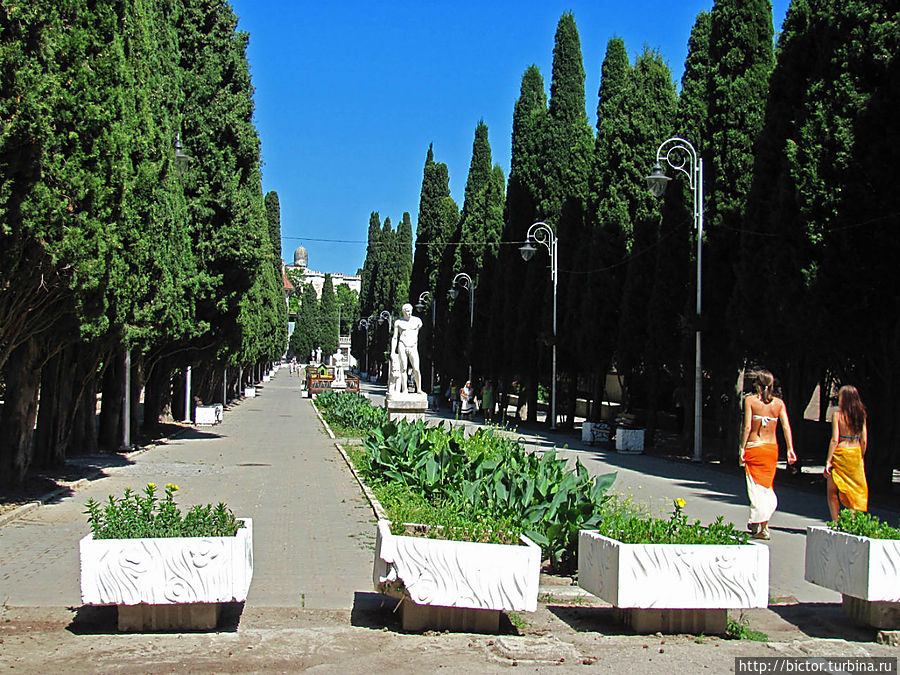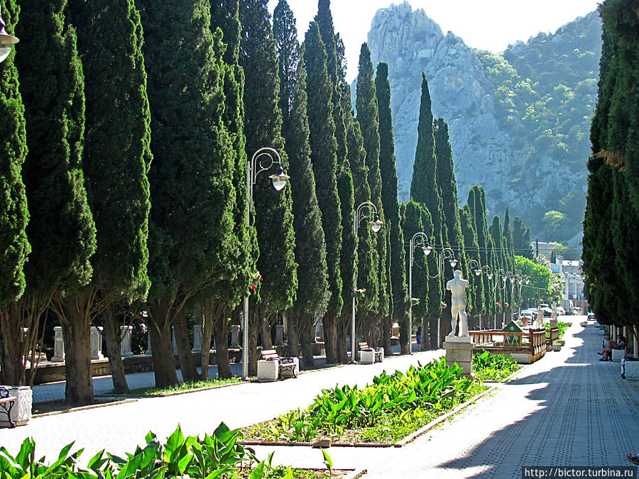 Въехав в Симеиз, мы решили оставить машину на окраине и прогуляться пешком. Город стоит на ранг выше Алупки и весьма привлекателен. Есть верхняя часть города, здесь парки, цивилизация (магазинчики, остановки и ларьки «Союзпечать») и нижняя часть – морской променад с пляжем и ресторанами.
