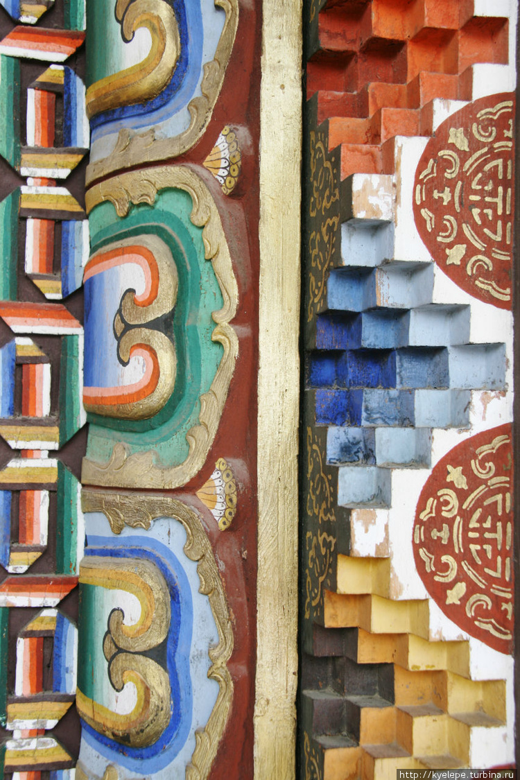 Здание главного храма было заложено в 1811 г. Оно было построено русскими зодчими, т.к. в то время буряты не умели строить из камня. Поэтому в архитектуре использовались элементы православного церковного зодчества. Позже здание было перестроено, однако сходство с церковью все равно прослеживается.