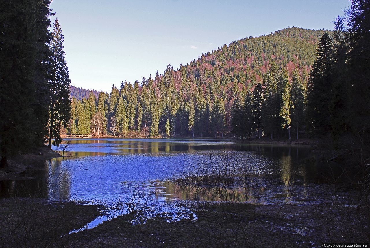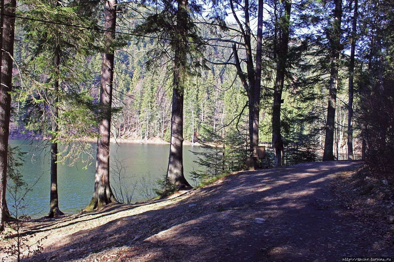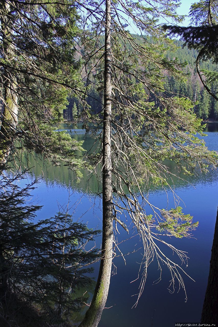 Так мы попали на восточный берег Синевира. Здесь реально деревья произрастают гуще, чем на противоположном. Потому мы не заметили здесь пешеходной тропы.