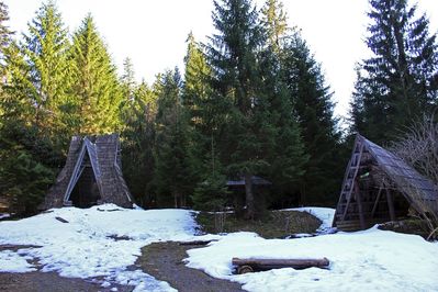 Но рядом с ручьем находится самоая большая площадка для отдыха и пикника. Правда, солнышко редко посещается это место весной, потому пока здесь лежат снега...
