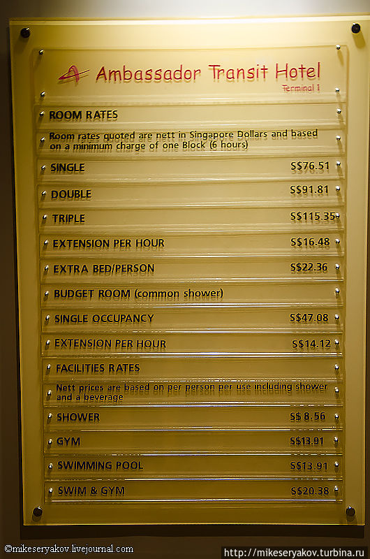 Вот такой прейскурант цен отеля «Ambassador” в Сингапуре.