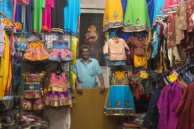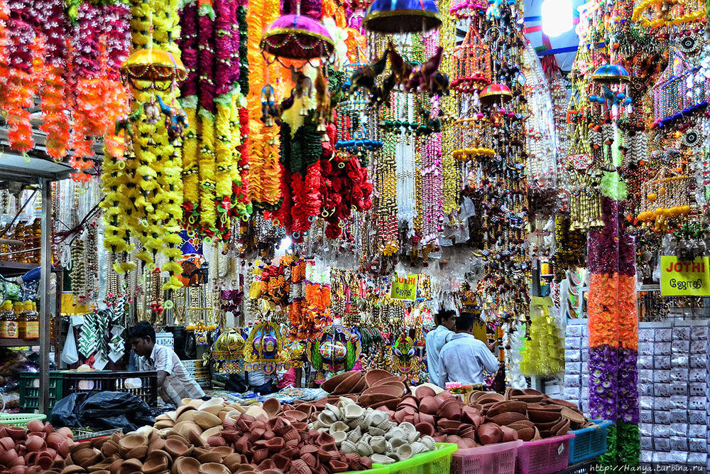 Путешествуя по Индии, мы уже наблюдали там такое скопище людей, но здесь почему-то это настораживает и пугает. Вокруг стоит шум и гам людских голосов, перекрикивающих льющиеся из каждой лавки индийские мелодии и песни. Вокруг витает аромат благовоний, увядающих цветов, молотых специй и волшебного, изумительного карри. Блестят в витринах женские сари, золотые украшения, гирлянды живых цветов. Теснятся лотки с товарами, которые продаются со скидкой. Открытые взору, работают пошивочные ателье; доверху, до самого потолка забиты рулонами ярких тканей полки в магазинах. В общем, что называется не пройти, ни проехать…