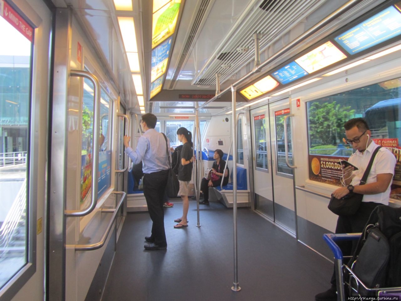 На инфостойке уточнили, что бесплатные экскурсии организуются из другого терминала, куда можно добраться на Sky train, легком метро без машинистов. Вагоны курсируют с небольшим интервалом челночным способом, нет давки и ажиотажа. Записываемся на ближайшую по времени экскурсию на 18.00. До сбора всей группы в 17.20 еще есть время перекусить и допить вино, которое могут экспроприировать при выходе-входе.