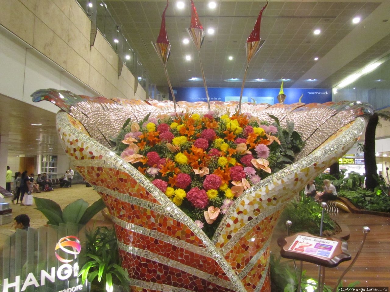 Нам уже не нужно регистрироваться, только дождаться информации по гейту отлета и, поскольку времени достаточно, углубляемся в изучения чудо-хаба. Аэропорту есть чем гордиться: можно воспользоваться спа-салоном, кинотеатром, бассейном. Что уж говорить, про электрические кресла для массажа ног. Пройдя по коридору, мы нашли такие и попытались насладиться отдыхом, но не тут-то было. Или наши ножки не привыкли к такому интенсивному массажу или механизм неправильно настроен, но терпеть удовольствие сквозь слезы мы были не намерены, и оставили эту попытку (или пытку?). Мы прогулялись по терминалу, постояли над большим водоемом с рыбками, полюбовались огромной вазой-букетом из мозаики и живых цветов. Шли вторые сутки нашего пути, и мы насилу дождались своего рейса JetstarAsia 3K161 в 23.30, чтобы опуститься в объятья кожаных кресел самолета.