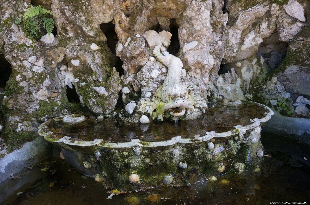 по обеим сторонам каменные скамьи, перед ним стол, напротив фонтан с именным гербом Монтейру, на создание которого автора вдохновило «Рождение Венеры» Боттичелли. Ракушка символизирует плодородие и изобилие.