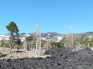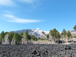 Дорога привела нас на большую площадку, где расположились парковка для автомобилей, база для туристов, поднимающихся выше к действующему кратеру, и два сувенирных киоска. Окружающий нас пейзаж был весьма необычен: черные-черные реки вулканических камней (следы от потоков лавы) с остовами деревьев, зеленые прогалины с елями и белоснежные склоны.