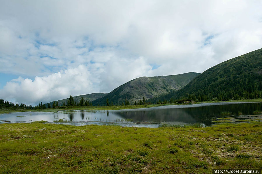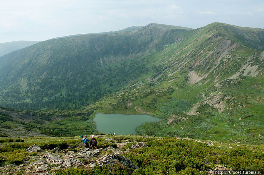 Паша сделал панораму, я групповушку (групповой снимок всей команды) и стали спускаться к озеру Сердце. Озеро действительно имеет форму сердца и довольно красивое.