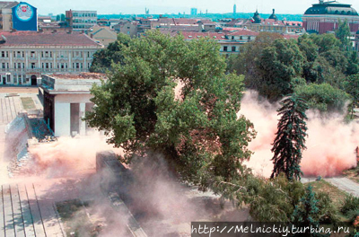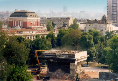 В то же время премьер-министр Болгарии заявил, что мавзолей будет ликвидирован. В течение 9 лет шли споры о судьбе мавзолея, победило предложение о сносе мавзолея, чтобы не допустить превращения в символ поклонения коммунистов. Партийные наследники Георгия Димитрова ничего не делали для спасения здания. Разрушение началось 21 августа 1999 года, задача стояла максимально быстро разрушить и освободить площадку от мавзолея. Первый взрыв не принес каких-либо повреждений мавзолею, последовал второй — результат тот же. Позднее было произведено еще три взрыва, каркас уже разбирали экскаваторами и шар-бабами. Последние остатки вывозили 27 августа. Шесть дней строили мавзолей, шесть часов горела мумия Георгия Димитрова и шесть дней разрушали его мавзолей. Как будто бы с того света Вождь Коминтерна призывал одуматься. (фото из интернета) (фото из интернета)