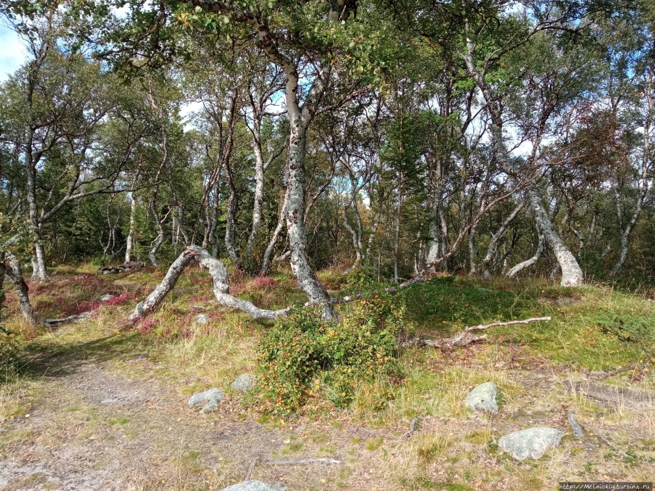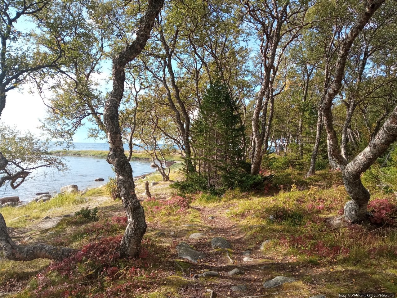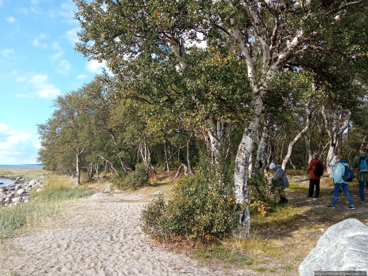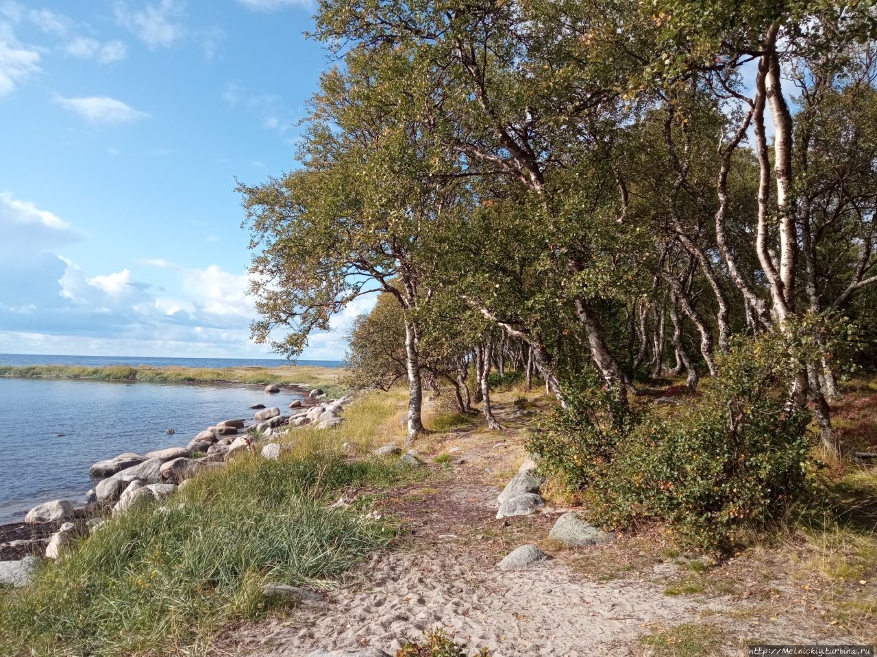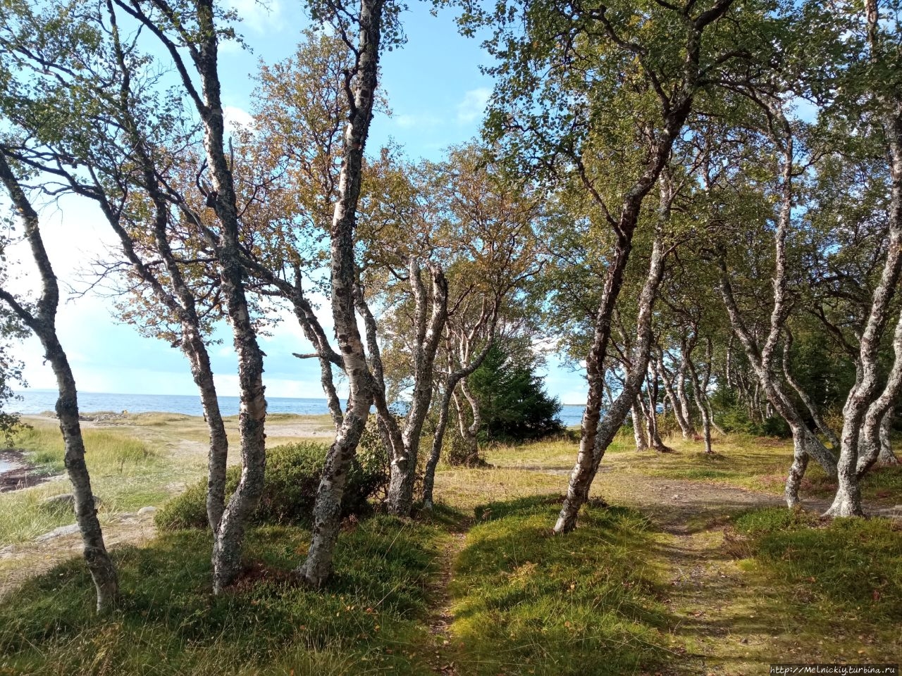 По пути к мысу выходишь к небольшой рощице с танцующими березками с причудливо изогнутыми стволами. Искривлены они из-за воздействия внешних факторов – переменчивой погоды, сильного ветра, обильных и долгих снегов.