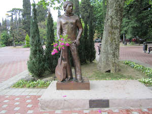 В один из дождливых дней, чтобы не сидеть дома, решили с подругой поехать из Лоо в Сочи Пока ехали в электричке приобрели путёвки на экскурсию по Сочи. Программа предусматривалась на 4 часа, посетили парк "Ривьера", Агурские водопады, Ахун гору, и парк у концертного зала "Фестивальный".Когда высадили группу из автобуса у парка, все мы пошли в первую очередь к фонтанам, уж очень они красивы.Пофоткались у фонтанов и разбрелись по парку.И совсем рядом с фонтанами обнаружили памятник моему любимому актёру.