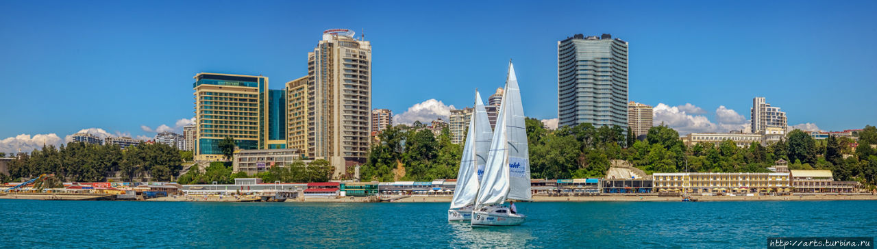 На сшитой из 3-х снимков фото панораме хочу показать как выглядит с моря набережная пляжа "Маяк" и центр Сочи на фоне удачно попавшихся в кадр гоночных яхт "Elan 210"