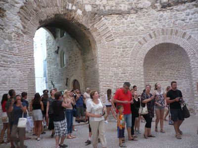 Узенькие улочки нас ведут к центральной части дворца – Перистилю. Перистиль дворца императора Диоклетиана это впечатляющая площадь, дошедшая до наших дней с римских времен. В древнем Риме перистилем называли открытый двор, окруженный со всех сторон крытой колоннадой. Чтобы попасть на площадь, нужно сначала пройти через бывший вестибюль дворца. Это круглый зал, когда-то увенчанный куполом, а потолок был расписан фресками.