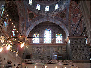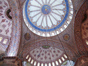 Да, мечеть действительно не настолько голубая, как говорит её название и даже может показаться немного скучной, особенно, если вы уже успели как следует пройтись по стамбульским достопримечательностям. Однако скука сразу развеивается, если уделить внимание деталям. Ведь внутри боле двадцати тысяч великолепных бело-голубых керамических плиток, каждая из которых сделана вручную мастерами из Изника. На изразцах очень много цветов. Одних только вариаций на тему тюльпанов более 50, а еще есть изображения гвоздик, роз, лилий, другие растительные мотивы.
