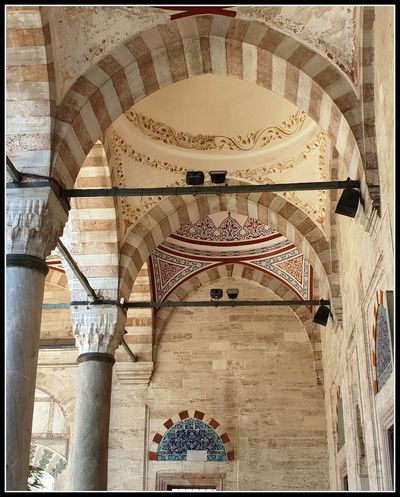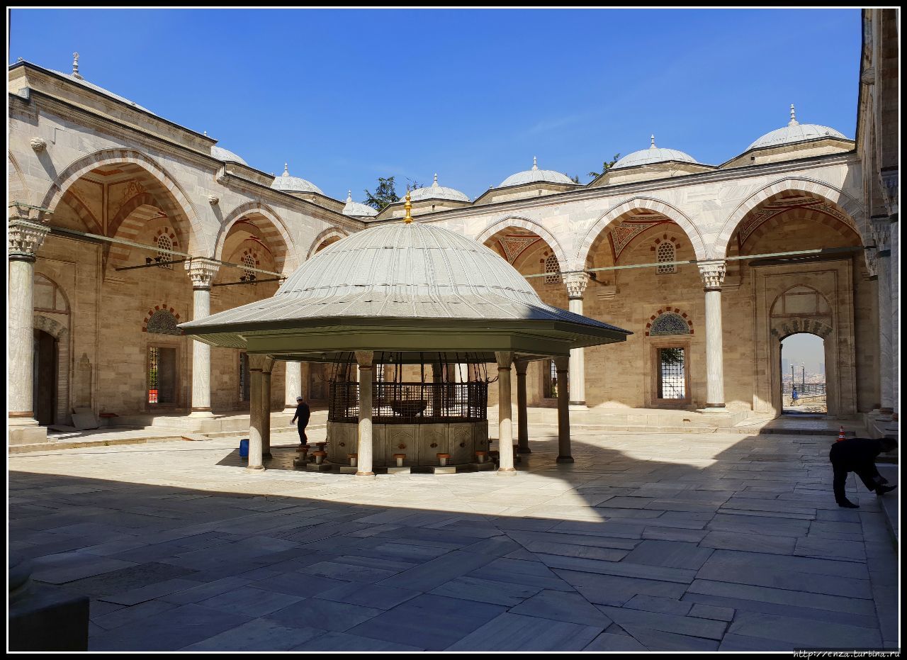 Портик опирается на 18 колон из мрамора и гранита, которые, скорее всего, позаимствовали у византийских зданий. Проходы под колоннами очень красиво украшены. Тут и каменная резьба, и прекрасные узоры-арабески на потолках, и нежные, ползущие по стенам ветки, совсем не подходящие для мечети грозного правителя.