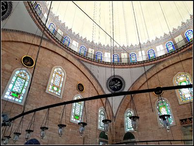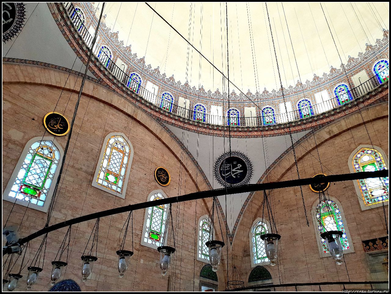 Внутри мечеть выглядит очень просторной. Причин тому две. Первая – это огромный купол диаметром 24,5 м. Вторая – отсутствие поддерживающих его колонн. Такое решение было рискованным, но тем не менее мечеть пережила ни одно землетрясение.