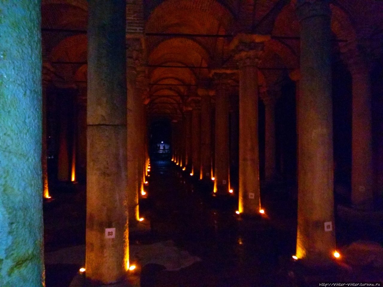 собором Святой Софии. Цистерна Базилика (цистерна Йеребатан) была построена в 528 году императором Юстинианом I и называется «Подземный дворец», так как поражает своими размерами: 145 × 65 м, вмещает 80 000 м³ воды, сводчатый потолок цистерны поддерживают 336 равноудаленных колонн (12 рядов по 28 колонн) 8-ми метровой высоты, стены толщиной 4 м сделаны из огнеупорного кирпича и покрыты специальным водоизоляционным раствором.Прокопий Кесарийский, византийский писатель и свидетель строительства так описывает сооружение этой цистерны: «Какие труды положил император, чтобы снабдить город водою, я сейчас расскажу. Есть очень большая зала, украшенная колоннами в виде четырехугольника. Эту залу окружают четыре галереи, с каждой ее стороны. Залу и одну из галерей, которая обращена к югу, Юстиниан углубил. Когда вода становилась желанной, нуждающимся позволялось ею пользоваться. Так император добился, чтобы византийцы уже не испытывали нужды в питьевой воде».