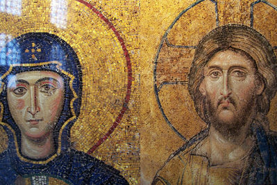 Мозаики Айа Софии Айа-София потеряла бы половину своей привлекательности для туристов, если бы не византийские мозаики! Ведь кроме этих выдающихся произведений искусства мало что напоминает о византийской истории храма. Сначала видишь мозаики в апсиде еще с первого этажа. Но, поднявшись на второй этаж, можно полюбоваться и восхититься мозаиками в полной мере. Богородица, Архангел Гавриил, Иоанн Златоуст, Император Лев VI, император Александр, императоры Константин и Юстиниан перед Богородицей...