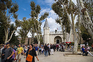 Дворец Топкапы – это, по сути, город в миниатюре, заходя за его стены сразу оказываешься в далеком прошлом. В течение 400 лет здесь правили султаны, тут жили их бесчисленные жены, слуги и стража. Дворец занимает довольно обширную территорию и состоит из четырех дворов. На входе меня снова встретила очередь, правда, не столь большая, как в Святую Софию. Стоя в очереди около 20 минут, я изучал туристов вокруг меня. Впереди стоял состоятельный англичанин, а позади – компания студентов из Бразилии. Русские в Стамбуле тоже встречаются, но наравне с другими, растворяясь в многонациональном потоке туристов. Скажу сразу – билеты в дворец Топкапы недешевы, вход в сам дворец стоит 25 лир, а если еще захочется посетить и Гарем (администрация понимает, что мало кто пройдет мимо), плати еще 20! Разумеется, на входе бдительная охрана просвечивает сумки туристов, у меня тут же обнаружили мини-штатив, надежно спрятанный в недрах сумки. Он составил компанию треногам других любителей путешествий и фотографии в комнате охраны, а мне выдали специальный номерок, второй такой же наклеили на штатив. Жаль, не удастся поснимать видео! Тут мое внимание привлек киоск с аудио-гидами, и я перестал сожалеть о штативе. Я взял аудио-гид на русском, что увечило мои расходы в музее до 55 лир.