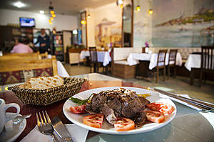 До Голубой мечети оставалось совсем немного, но тут я почувствовал острое чувство голода и чтобы вкусно покушать начал подыскивать кафе, полагаясь исключительно на интуицию. И она меня не подвела! Несмотря на то, что на пешеходных улочках расположено множество заведений разного уровня и там работают специальные зазывалы, я сразу заприметил одно интересное на мой взгляд кафе. И не прогадал – кафе оказалось очень уютным: мне понравились рисунки на стенах, яркие фонарики и вежливые улыбчивые официанты. Уже через 5 минут после моего заказа передо мной появились суп, тонко нарезанное и хорошо прожаренное мясо с рисом и вкусная только что испеченная лепешка.