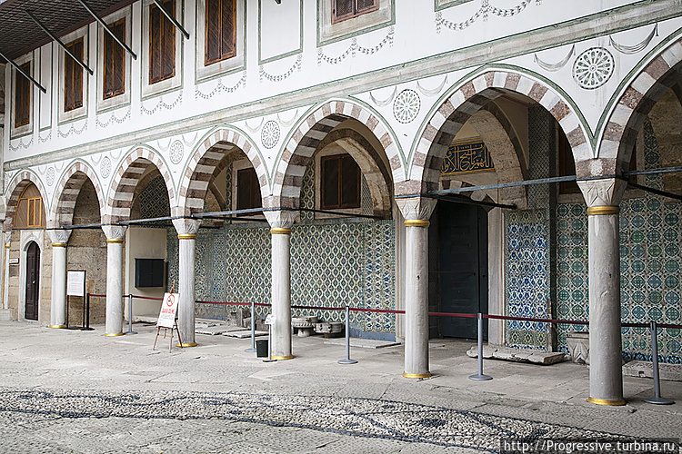 Но эти расходы оправданы – музей интересный! Старинная восточная архитектура, мозаики, колонны, сады – все это очень красиво. Кроме того, коллекции богатств султанов – троны, оружие, кафтаны, бриллианты и украшения стоит увидеть. Фотографии на память в роскошных интерьерах и во дворах и садах дворца получаются словно из древних сказок. Каждый турист найдет для себя что-то свое во дворце, и не пожалеет о его посещении! В первый двор дворца ведут Парадные Имперские врата “Баб и Хумаюн”, здесь находится церковь святой Ирины. Во второй двор ведут врата приветсвия “Баб и Селям”. Здесь в райском саду с фонтанами и павлинами проходил высший совет во главе с султаном, на него собиралось до 5 тысяч человек! Во втором дворе находится знаменитый Гарем – дворец во дворце, обставленный с восточной роскошью. Вход в Гарем был закрыт для всех, кроме султана и его личных слуг. Разумеется, за нарушение несчастному любопытному грозила смерть. Девушек в гарем привозили со всей Османской империи, некоторых преподносили султану в качестве подарка иностранные цари. Разумеется, в наши дни только и остается, что фантазировать – ни султана, ни девушек тут уже нет, зато гулять по лабиринтам Гарема можно сколько угодно, сегодня за это уже жизни не лишают :) В третий двор ведут Врата Счастья – здесь в павильоне Святой Мантии расположен музей, где и представлены все сокровища султанов, среди которых знаменитый алмаз “Кашикчи” размером 86 каратов. В сокровищнице музея запрещают снимать, иногда строго, иногда не очень, мне пару раз удавалось незаметно сделать по несколько снимков. Полагаю, везде установлены камеры, так что сильно нарушать правила я не стал.